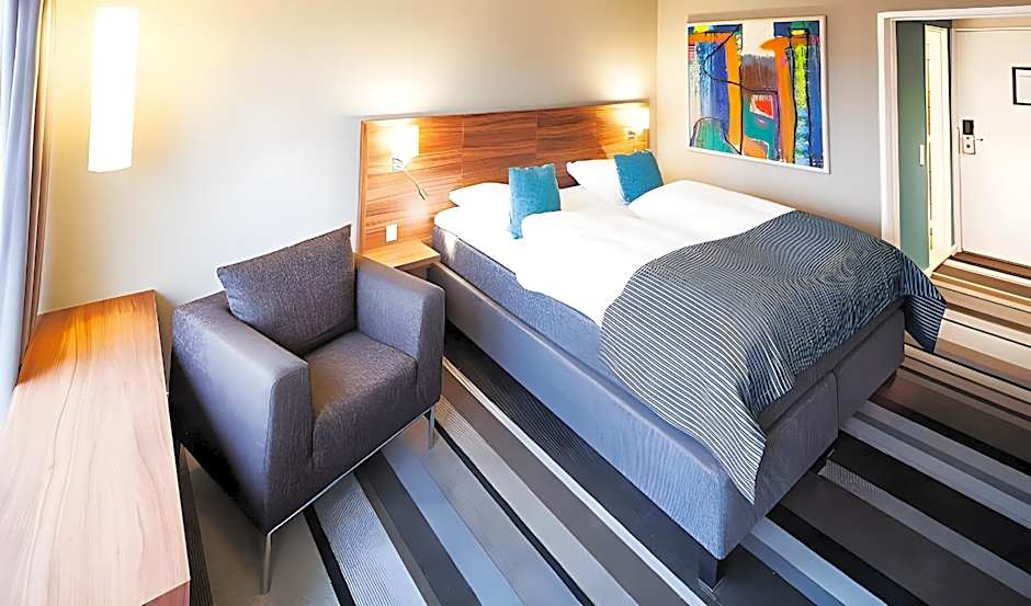 This double room has views of the city of Aarhus, and includes a desk, wardrobe, a TV with Chromecast, tea/coffee facilities, and a private bathroom with a bathtub.